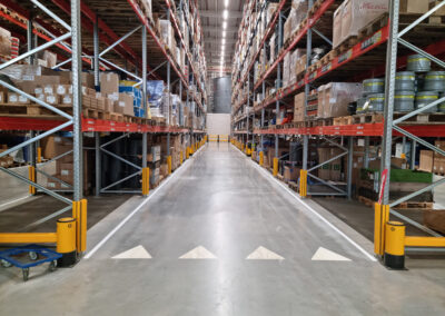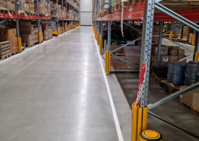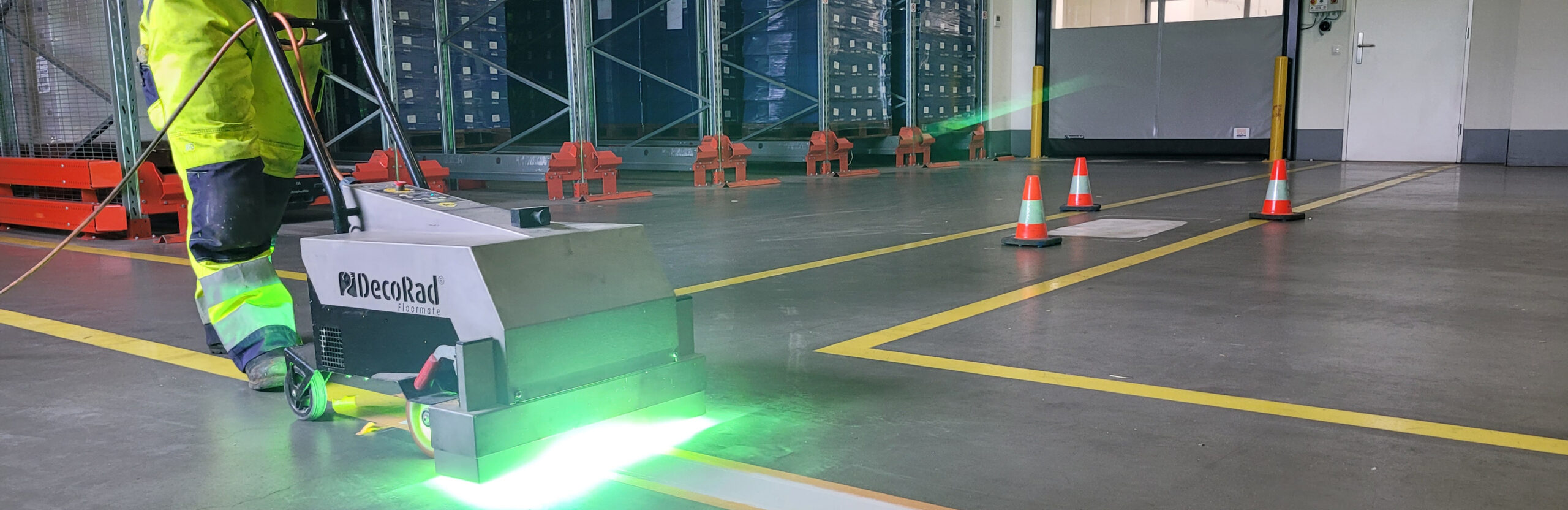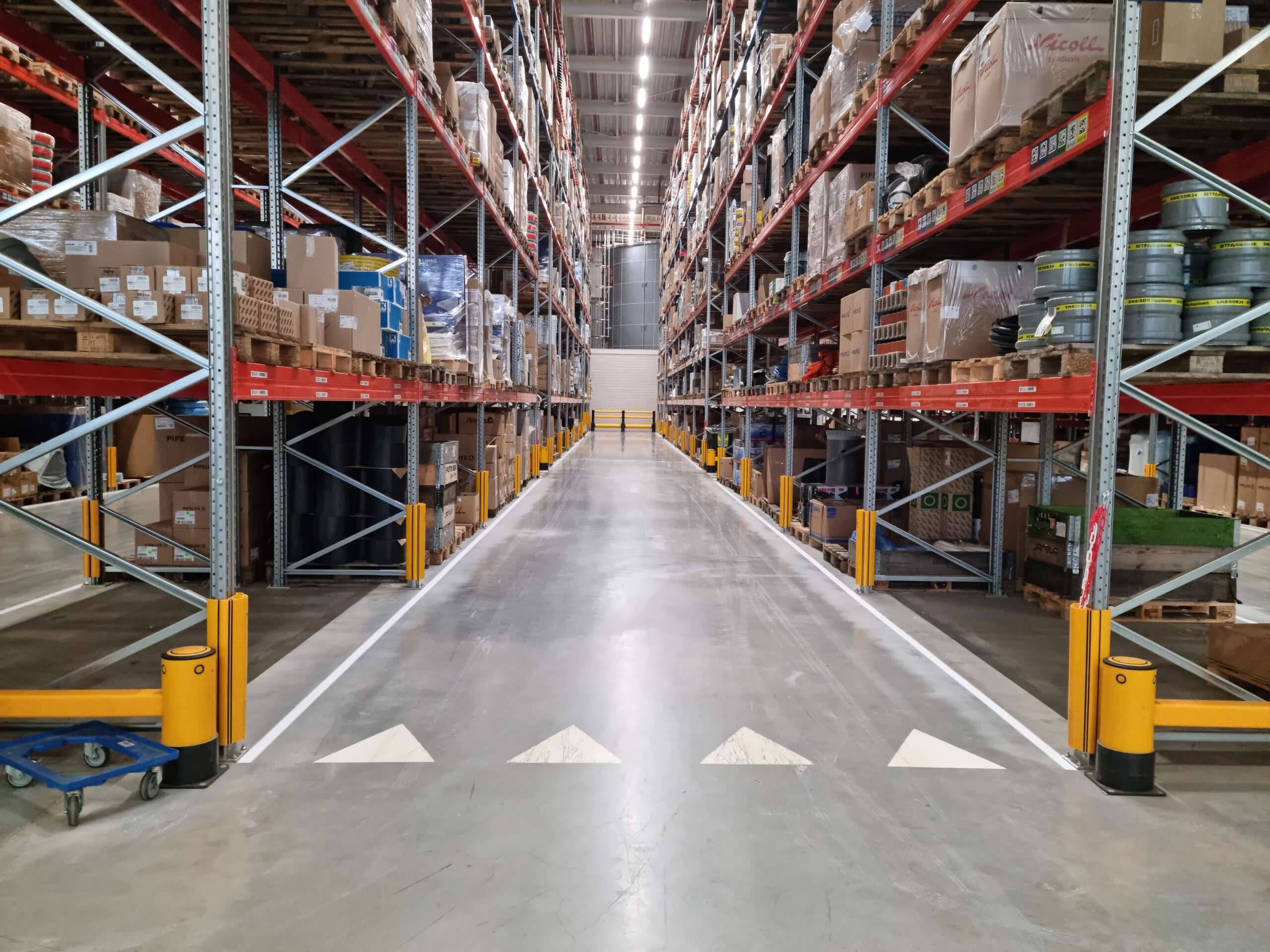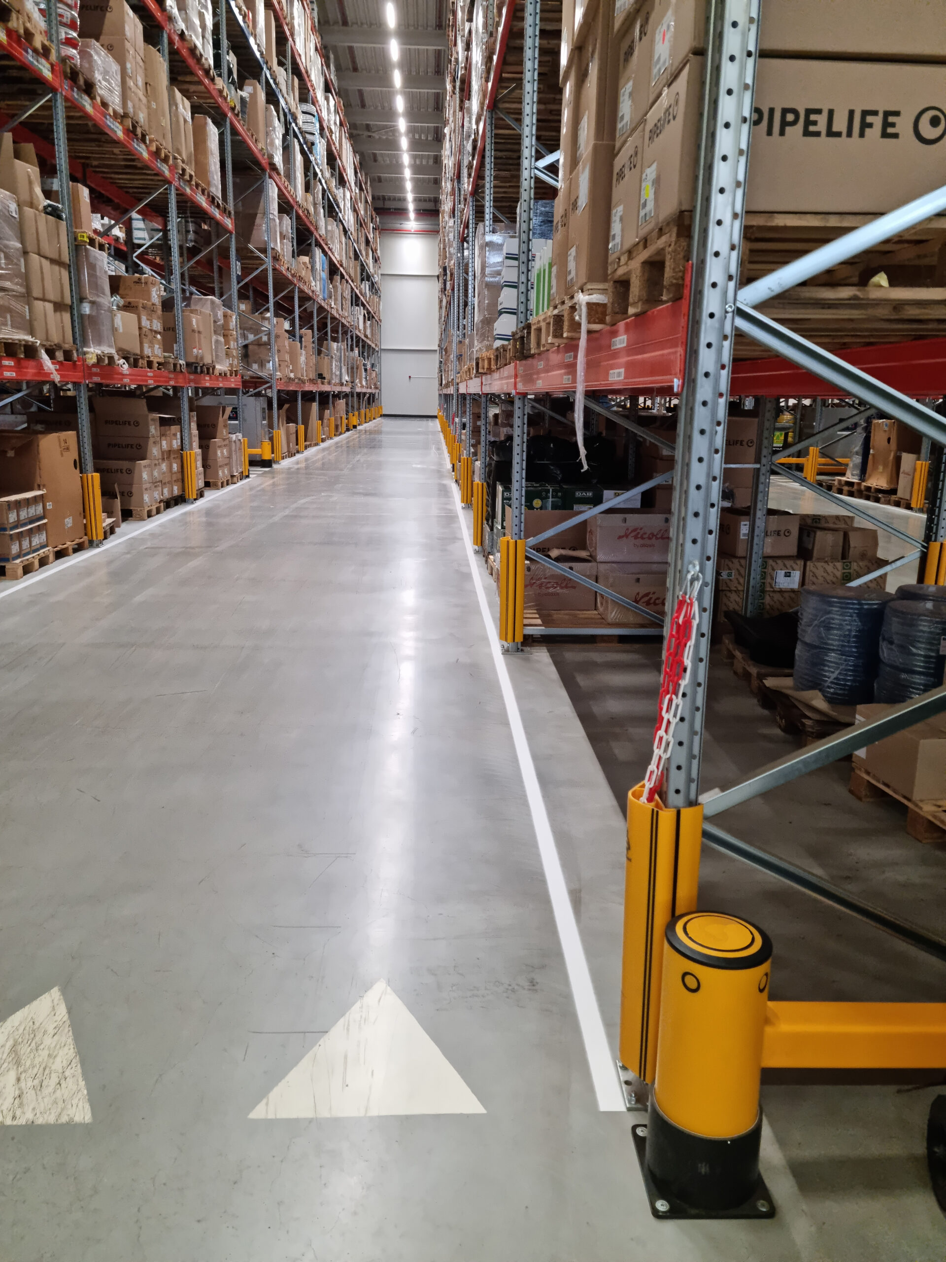 In een groot magazijn hebben wij vlak voor de stellingen een belijningsstreep van 5cm breed aangebracht. Hierdoor kunnen magazijnmedewerkers de pallets nauwkeurig wegzetten. De pallets steken niet meer uit en staan keurig in lijn.