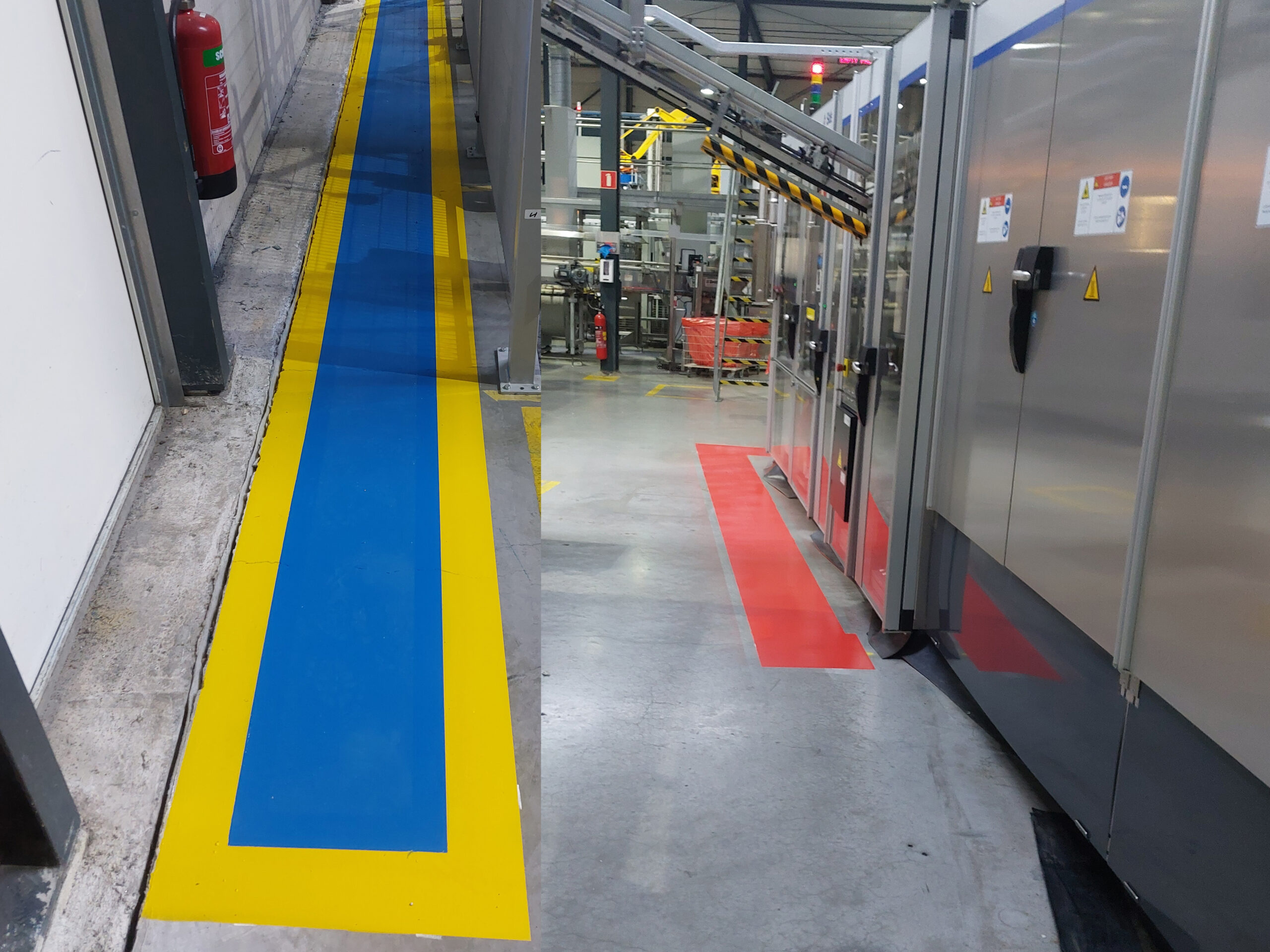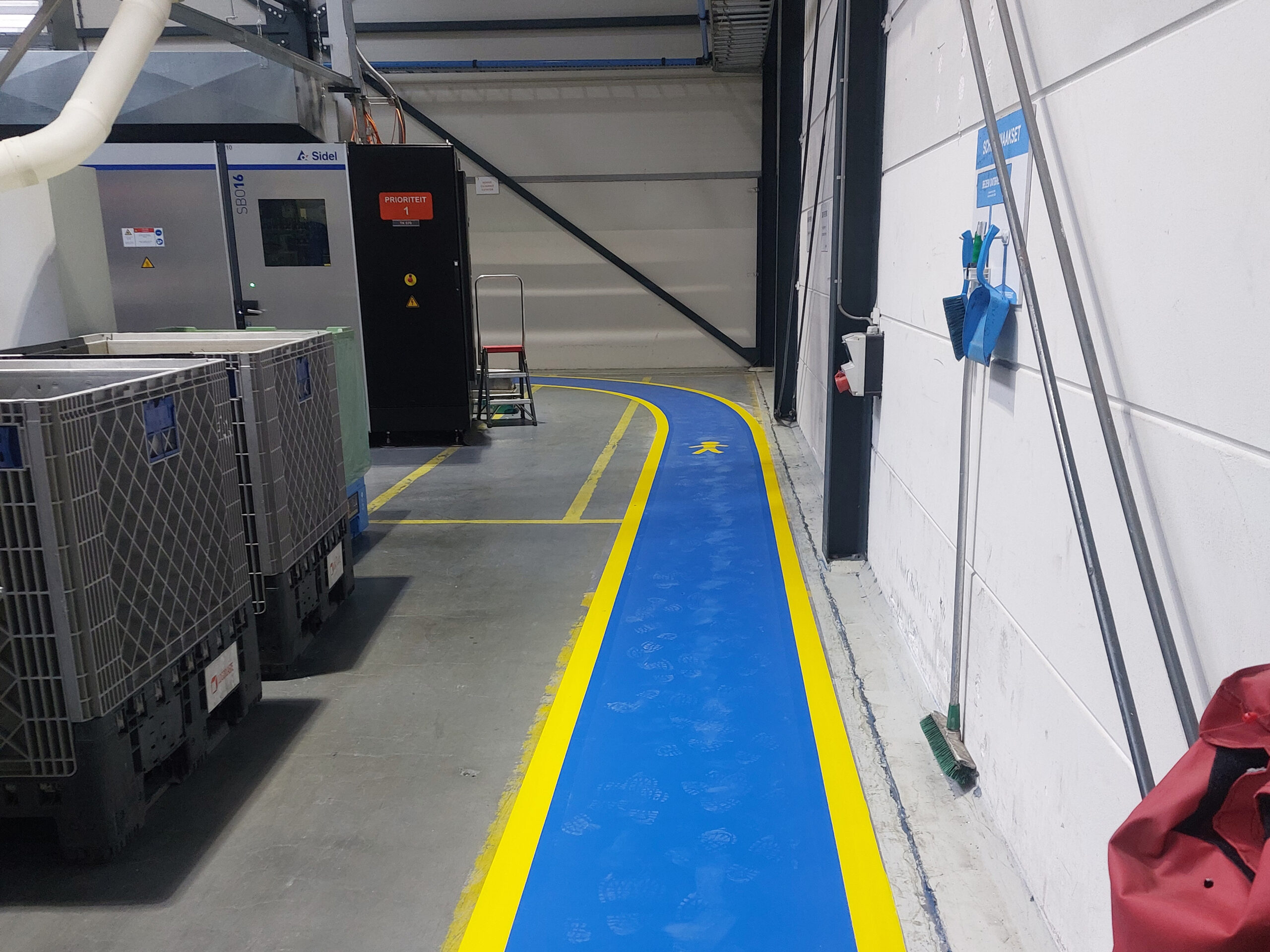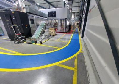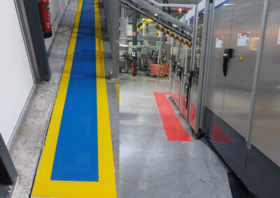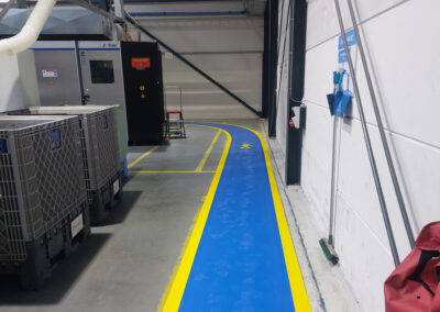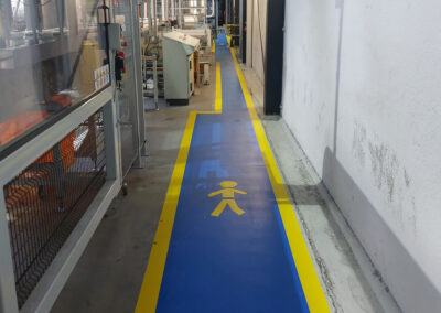 De belijning voor de Looppaden hebben wij uitgevoerd in een opvallende blauwe kleur. Als extra accent hebben wij de blauwe looppaden omrand met een gele lijn. De elektrische installaties en werkplekken hebben wij aangegeven met een rode kleur.