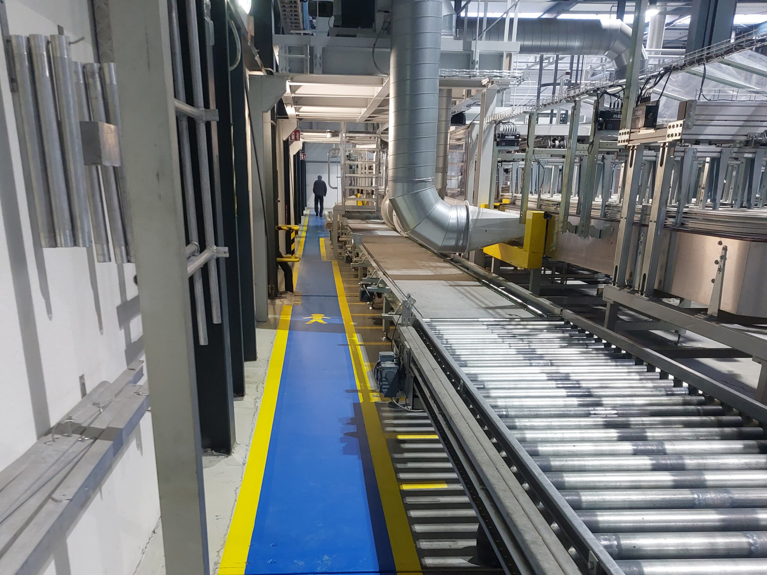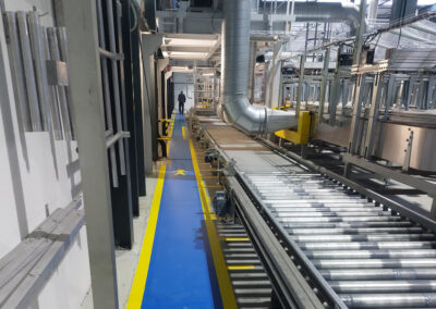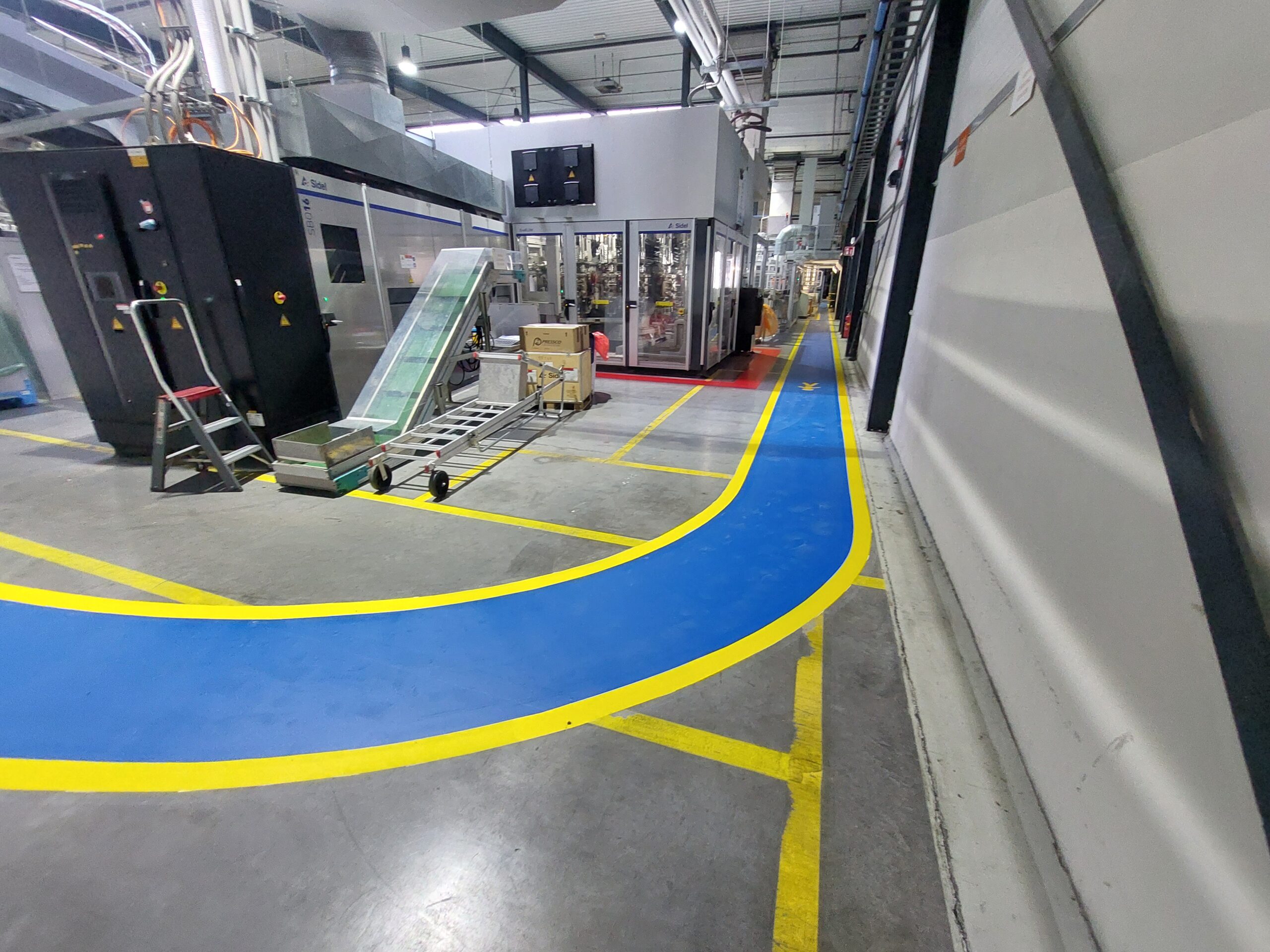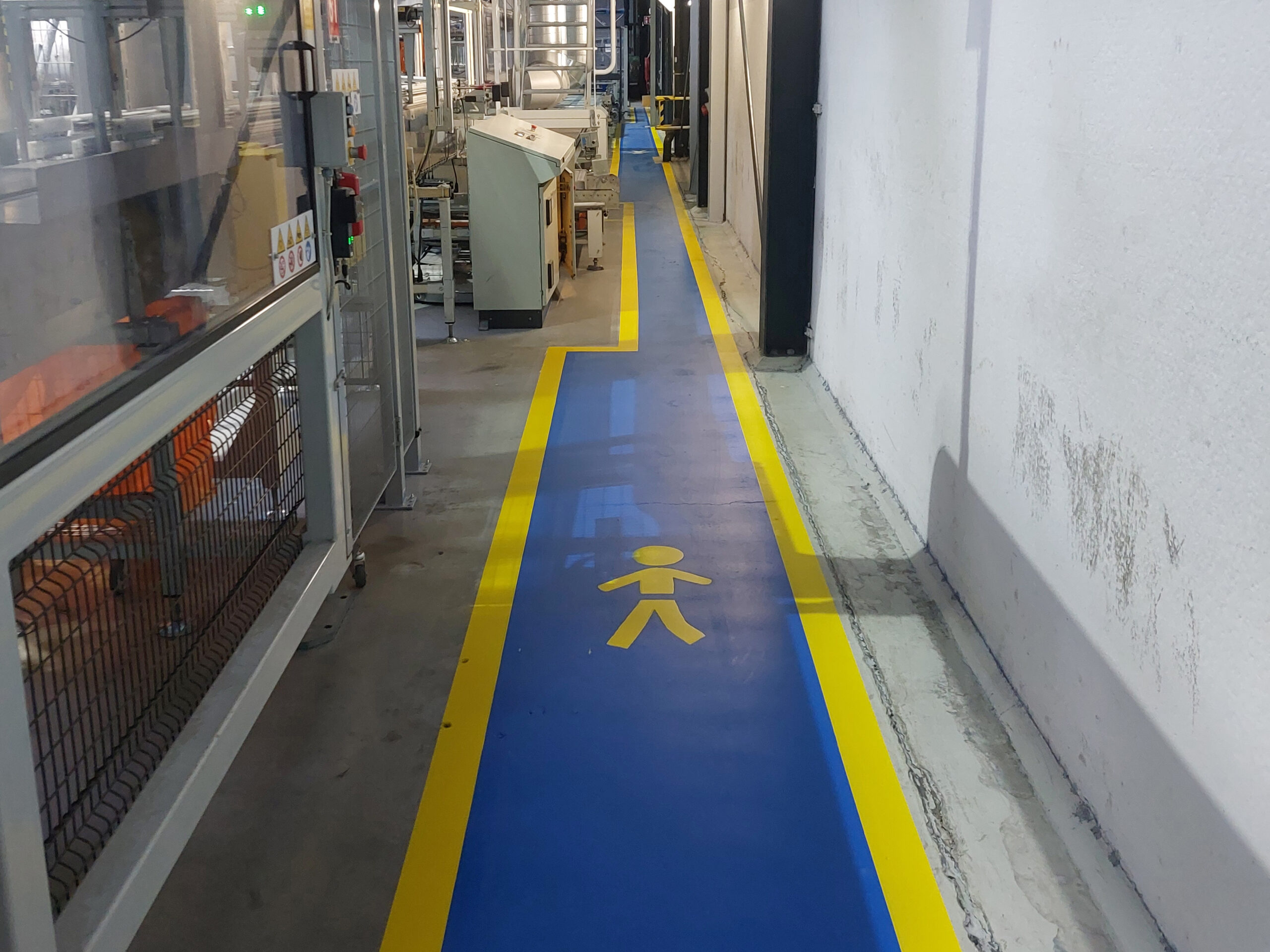 De belijning voor de Looppaden hebben wij uitgevoerd in een opvallende blauwe kleur. Als extra accent hebben wij de blauwe looppaden omrand met een gele lijn. De elektrische installaties en werkplekken hebben wij aangegeven met een rode kleur.