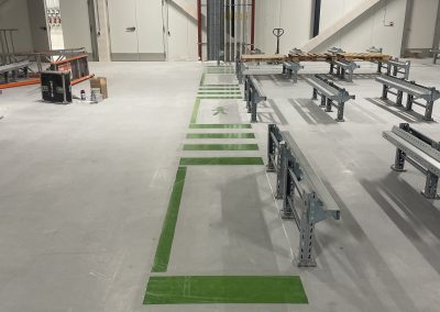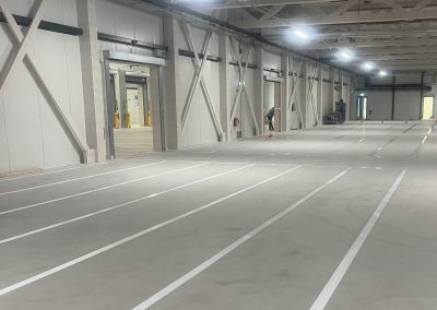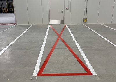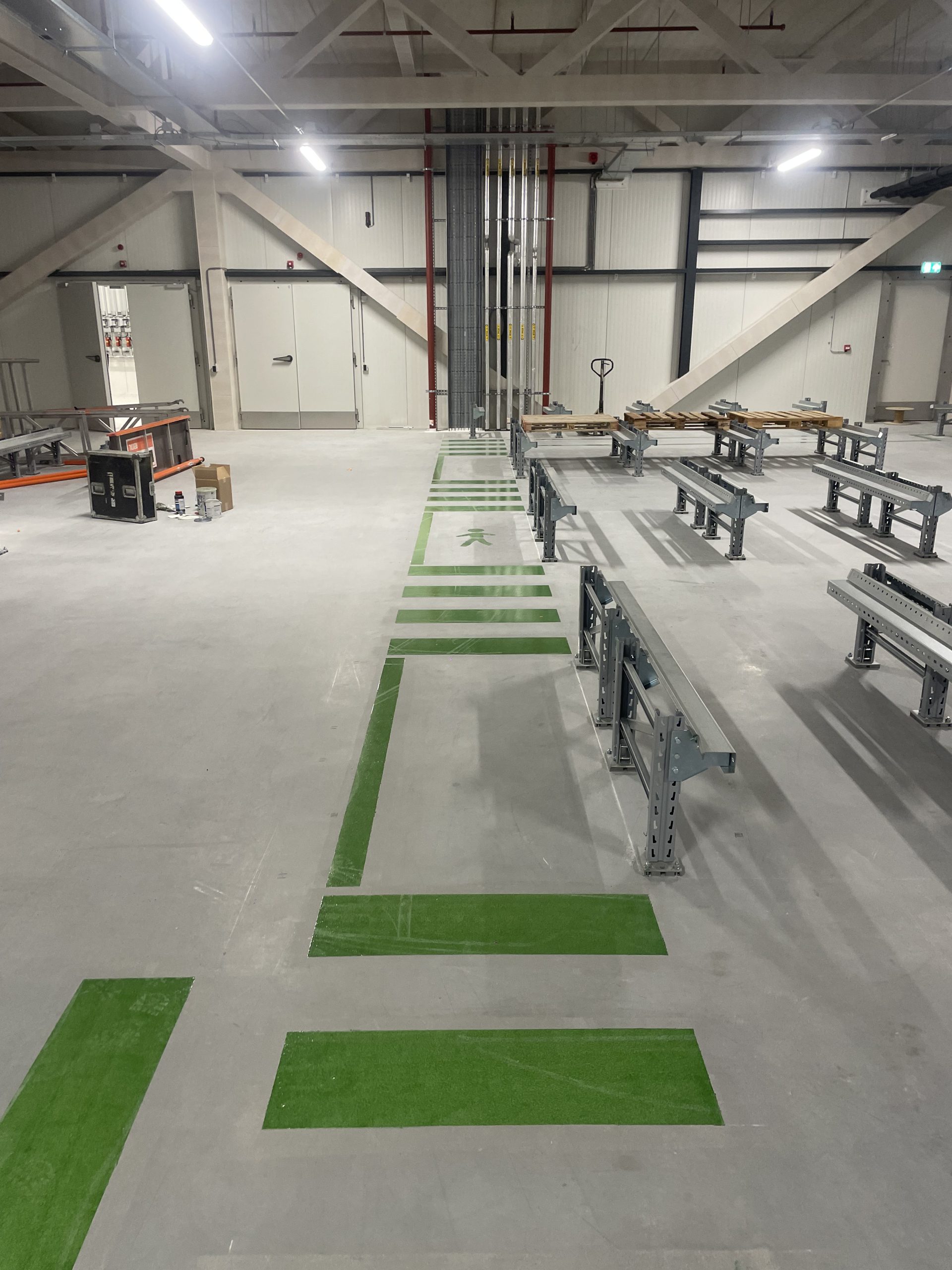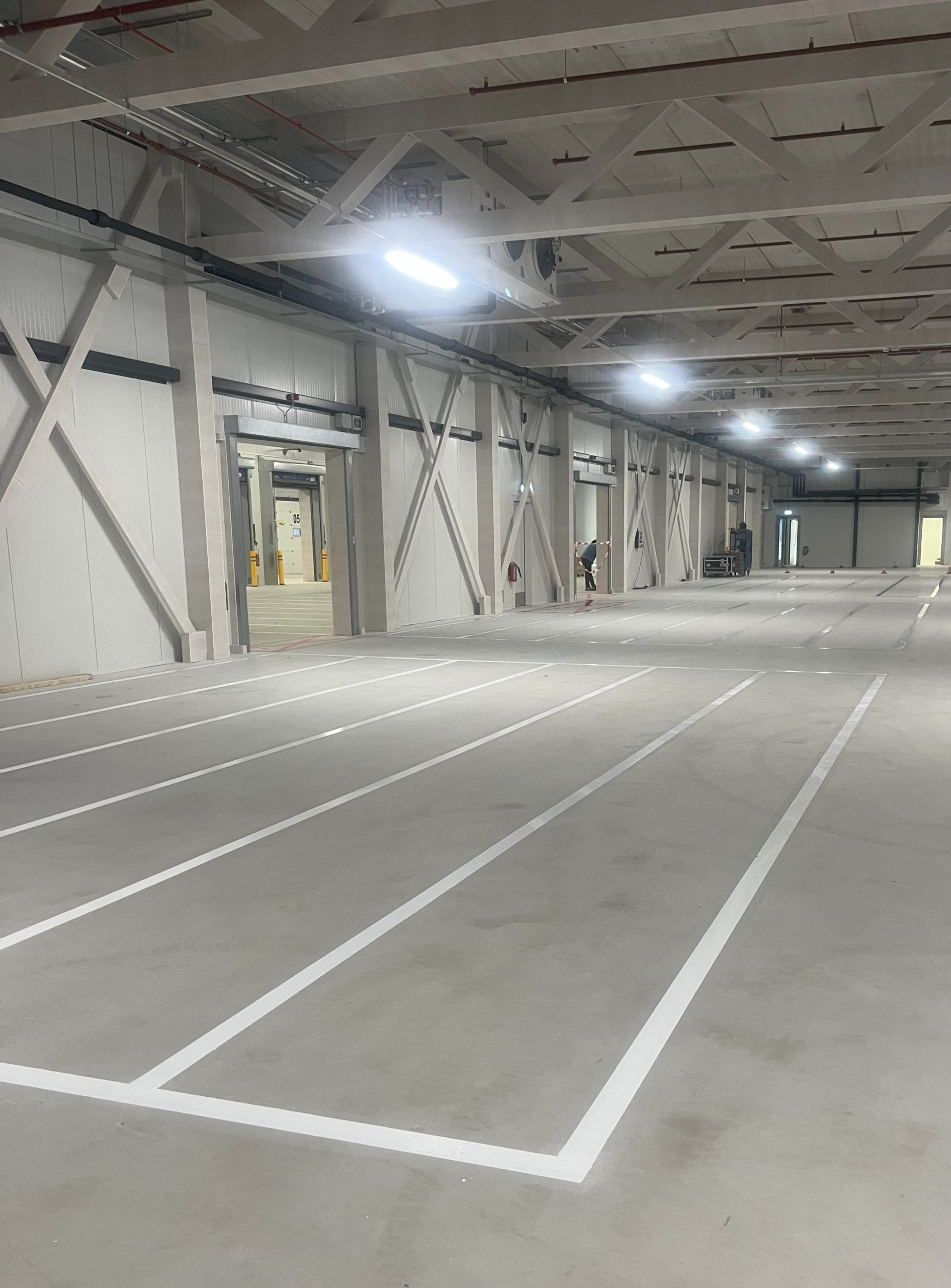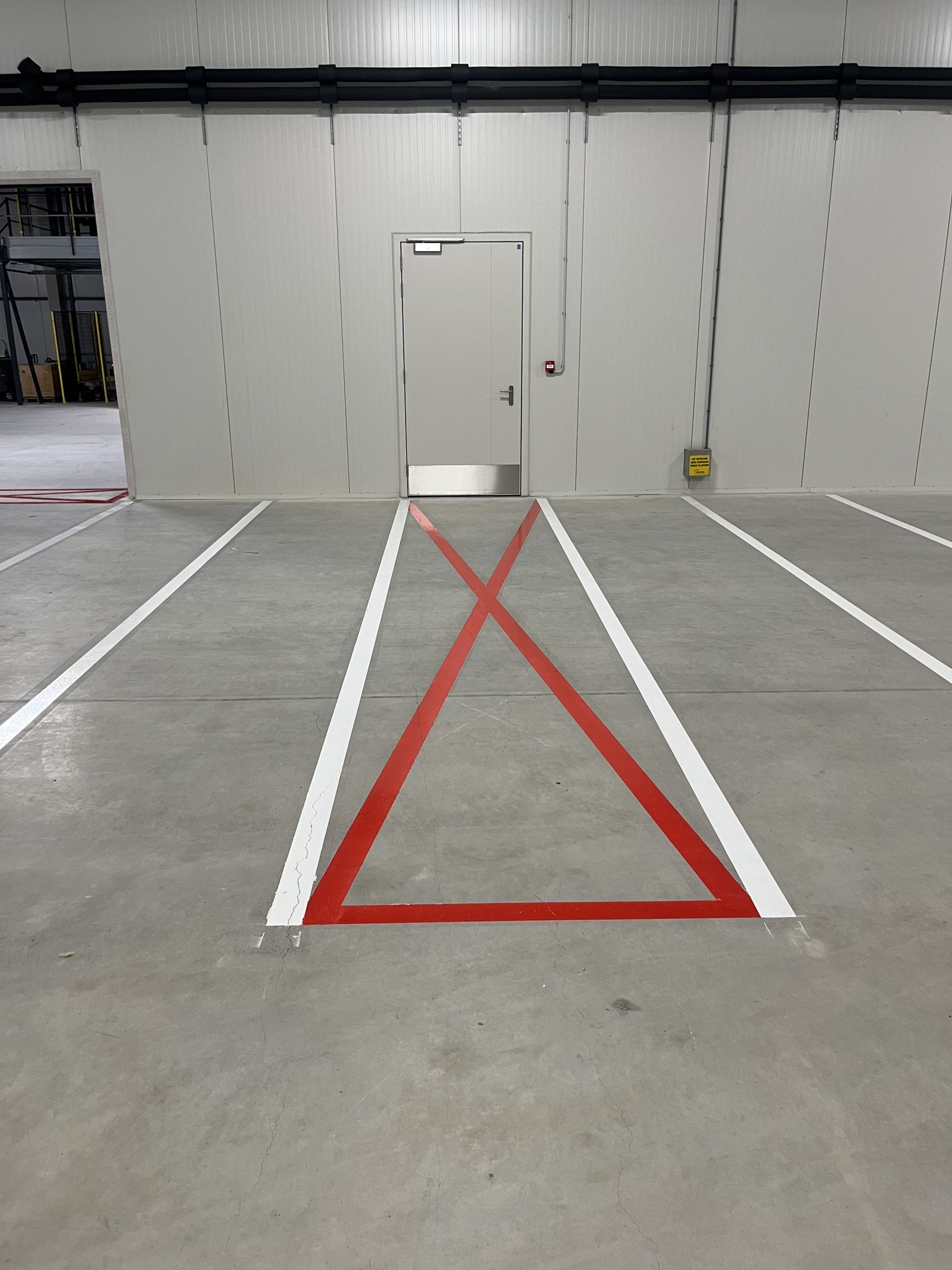 In de nieuwe vrieshal die vastgoedbedrijf Elsrijk samen bouwt met de B&S Group in Dordrecht – internationaal bevoorrader van vliegvelden, cruiseschepen en webshops – zijn Kevin Heuven en Jerry Woudstra van Rapidline bezig belijning aan te brengen met Solidlux-coating. Die zijn onmisbaar voor de veiligheid en een goede, logistieke distributie van alle pallets en goederen. Groene lijnen geven de looproutes aan, op rode lijnen mag niets neergezet worden, de blauwe lijnen staan voor pallets die verplaatst moeten worden en de witte lijnen geven aan waar de pallets op de vloer gepositioneerd kunnen worden.